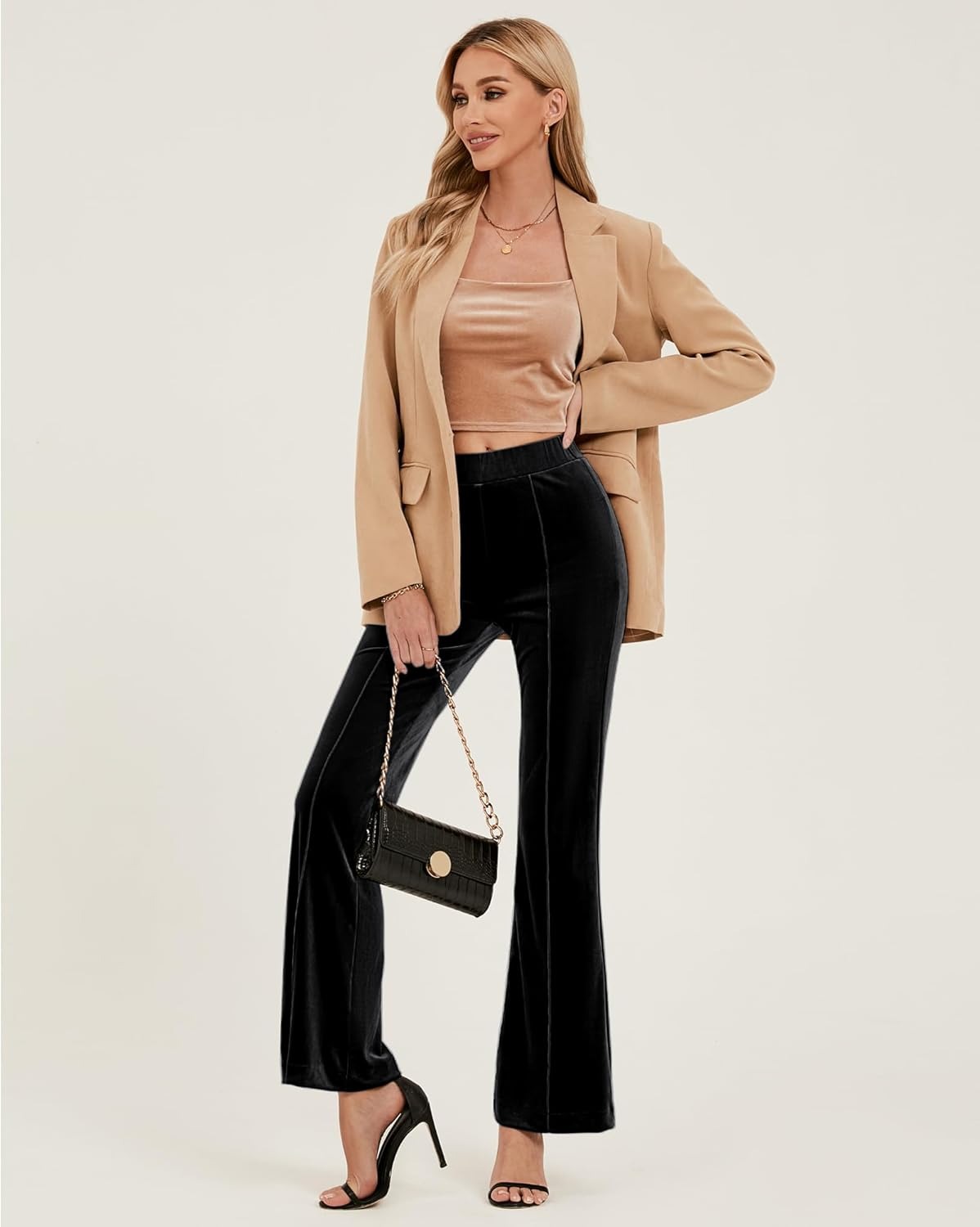 • Features – our womens pull on pants combine fashion and comfort seamlessly with a high rise elastic waistband, pull on closure, vertical front seams, flare leg opening, a soft velvet fabric and no pockets.